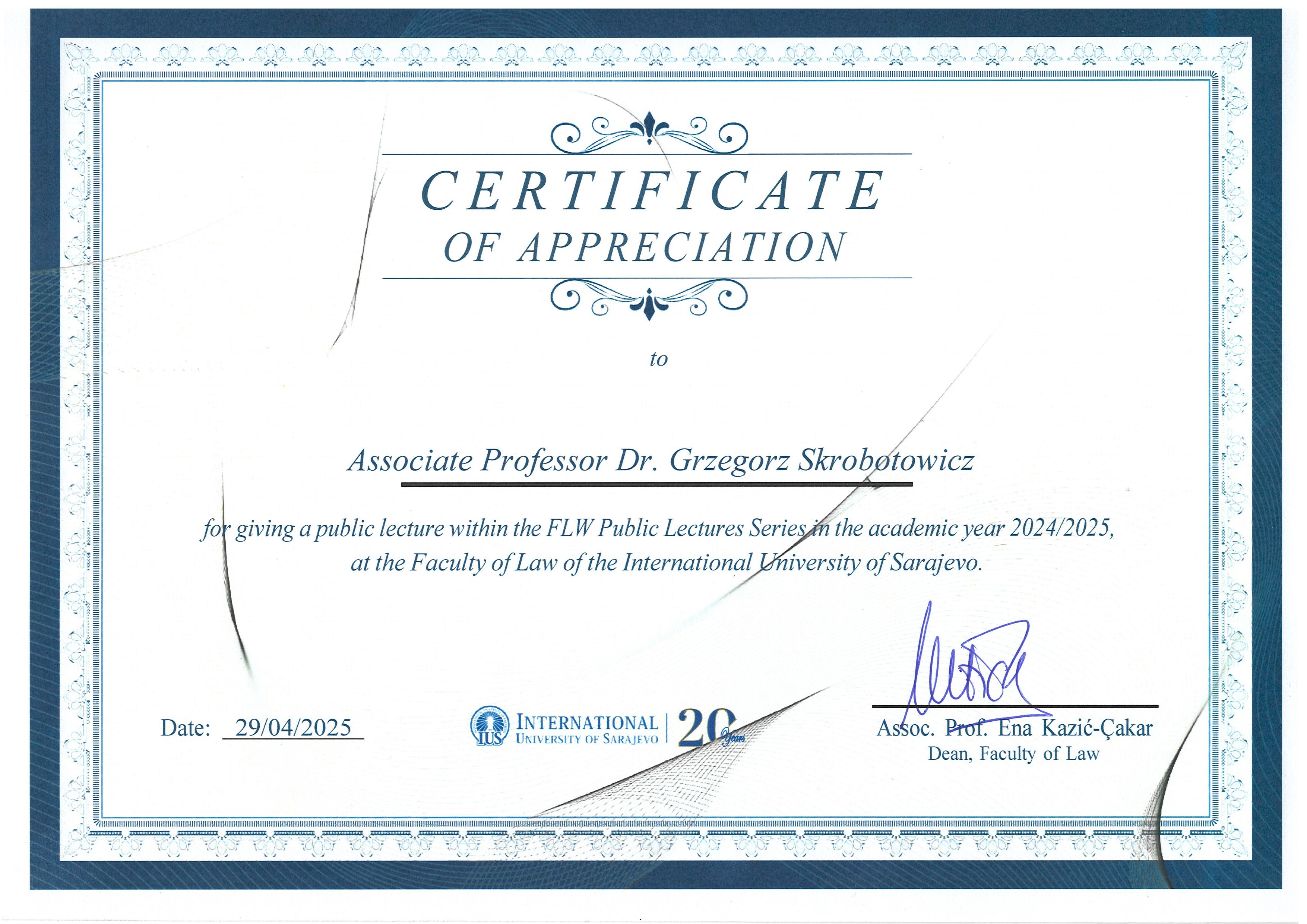 - Prowadzenie zajęć dydaktycznych na International University of Sarajevo (Bośnia i Hercegowina) w ramach programu Erasmus+ "Mobility Agreement Staff Mobility For Teaching" - kwiecień 2025 r. (certyfikat);